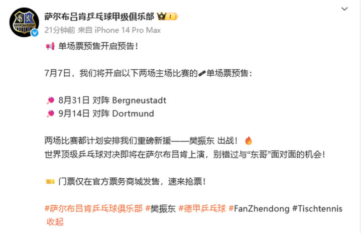 6月1日,德甲萨尔布吕肯俱乐部通过社交媒体宣布中国运动员樊振东加盟该俱乐部,征战2025-2026赛季德国乒乓球甲级联赛和欧洲冠军联赛。