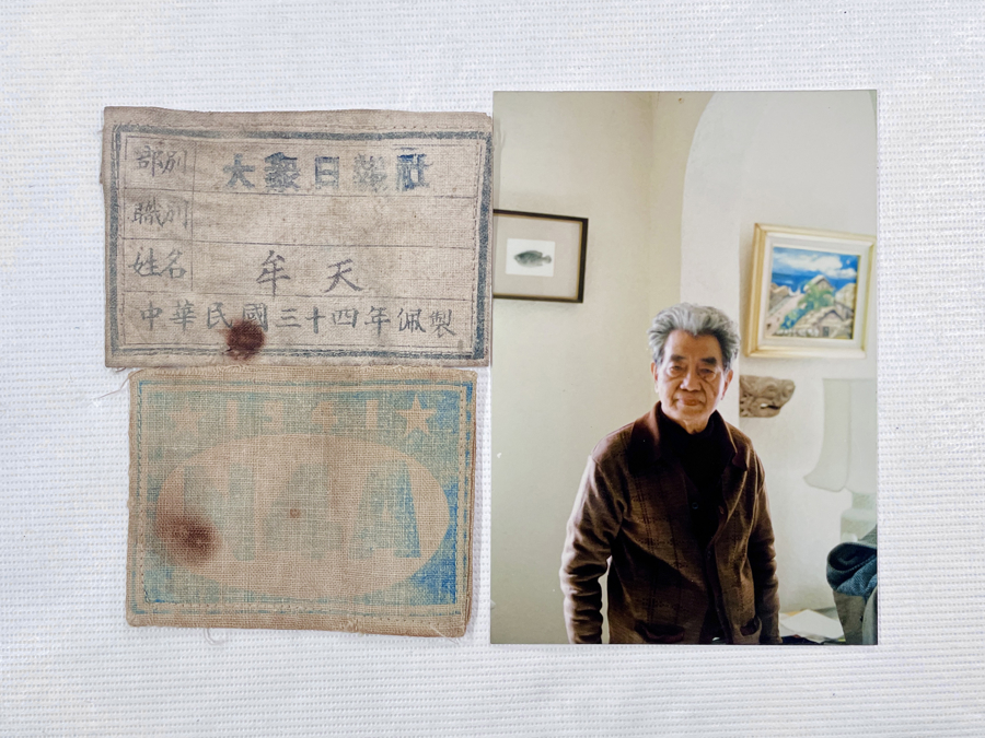 1941年新四军臂章 、庄索照片(背面赵坚题记)、1945年大众日报社记者证。